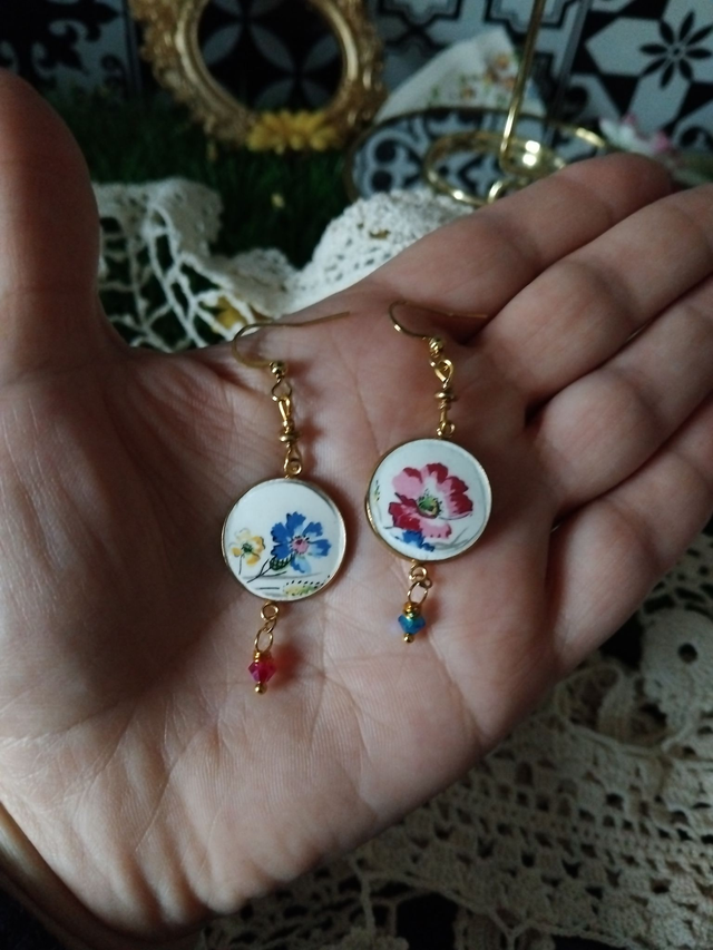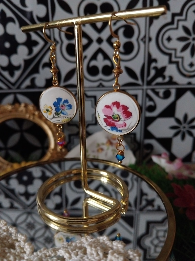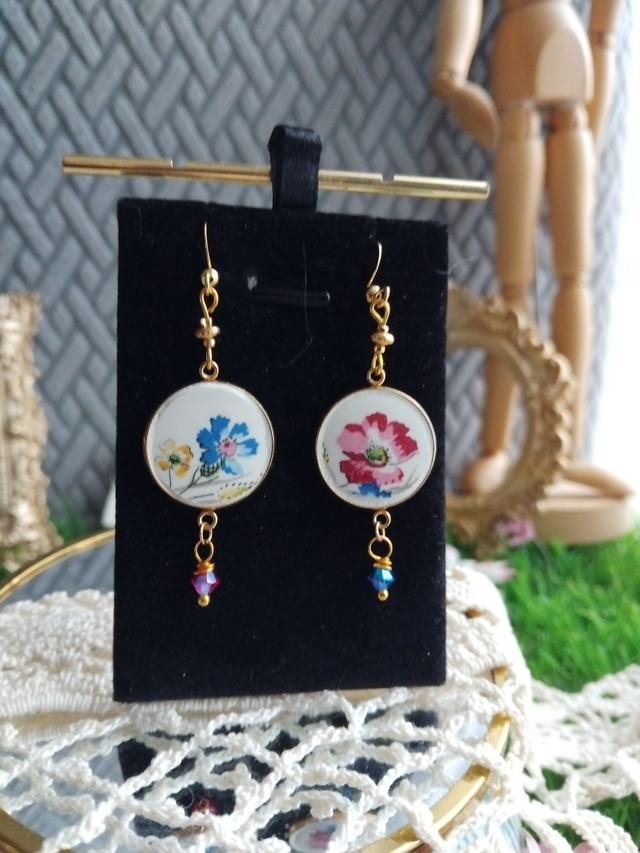 jolie paire de boucles d'oreilles réalisées avec de la vaisselle ancienne.