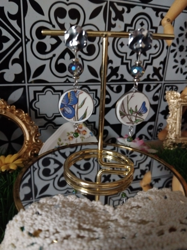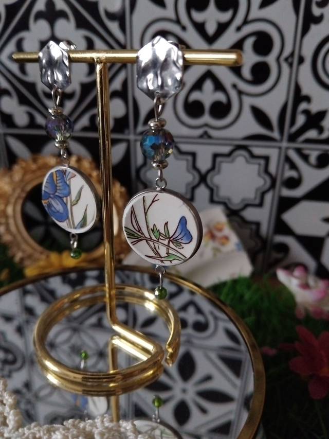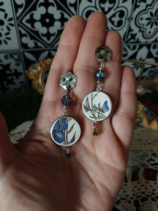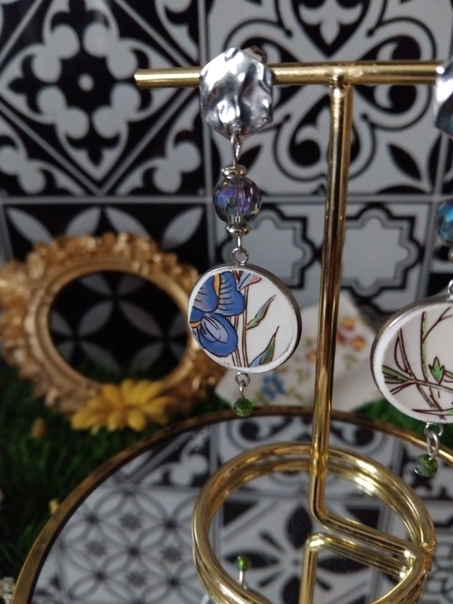 jolie paire de boucles d'oreilles réalisée avec un cendrier vaisselle ancienne de Sarreguemines.