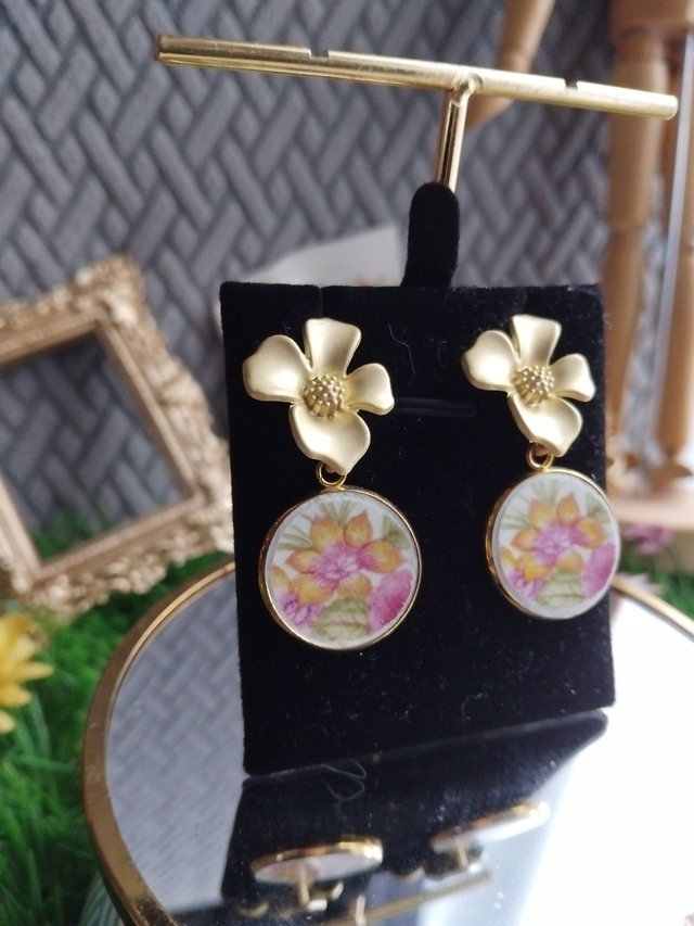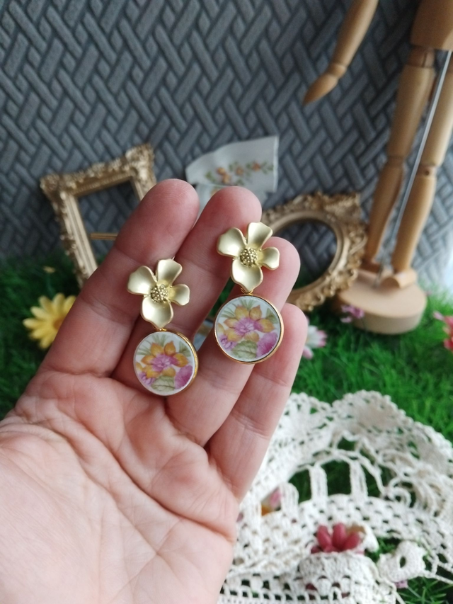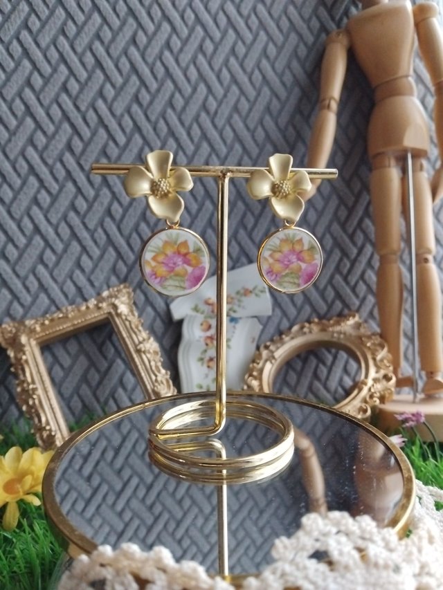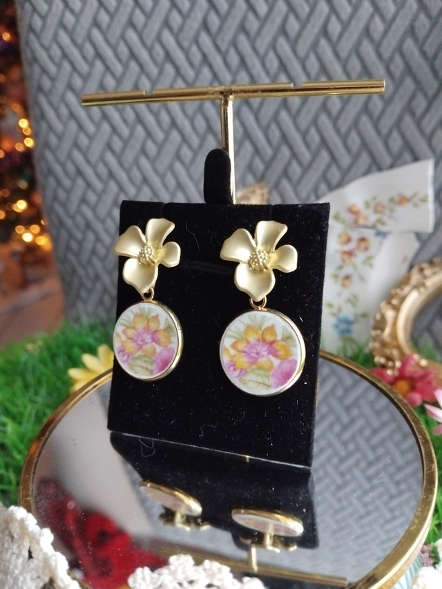 jolie paire de boucles d'oreilles créées avec de la vaisselle ancienne, motifs fleurs