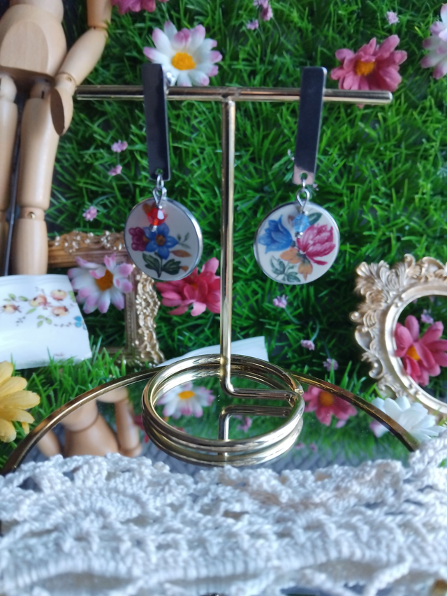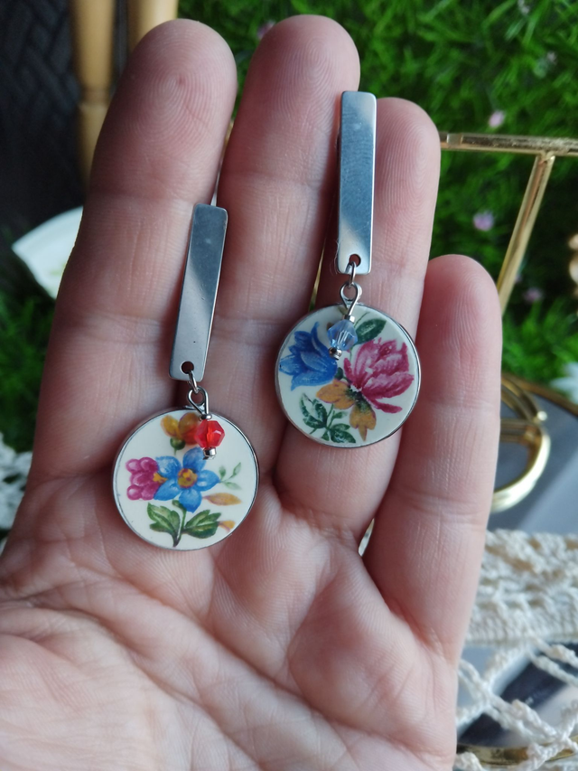 jolie paire de boucles d'oreilles créée avec de la vaisselle ancienne de Sarreguemines