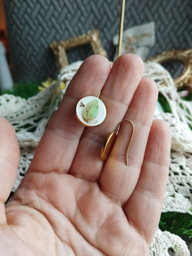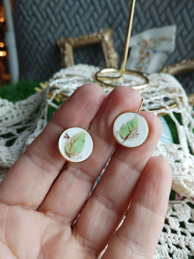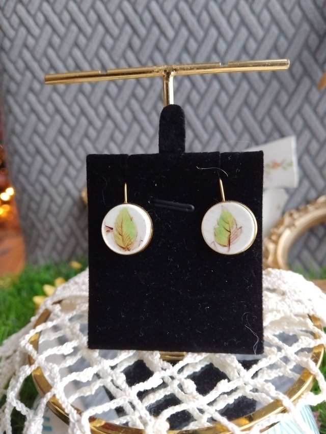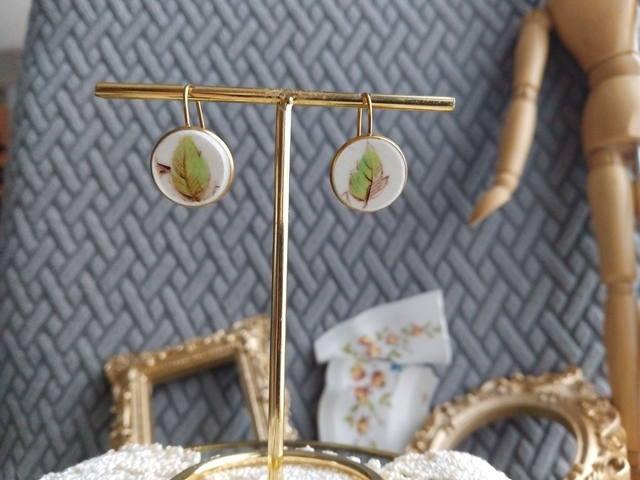 jolie paire de boucles d'oreilles créées avec de la vaisselle ancienne, motifs feuilles