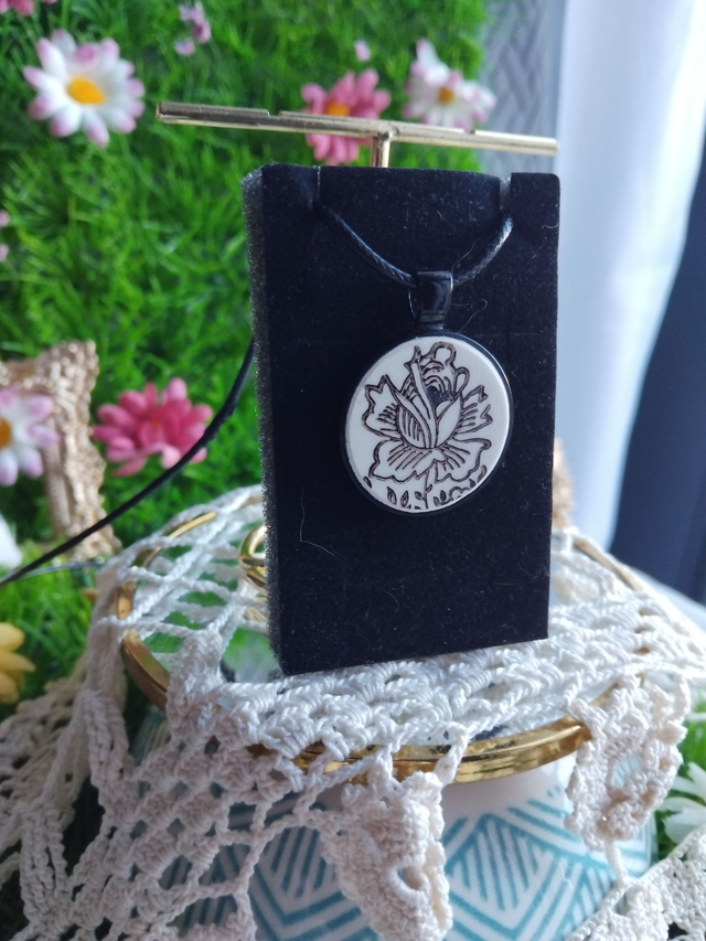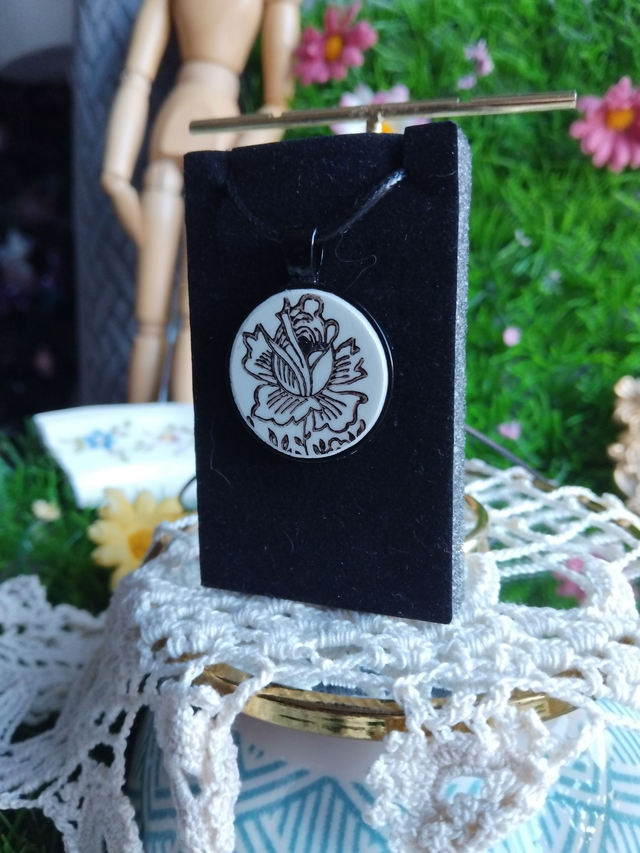joli pendentif créé avec de la vaisselle ancienne, motif fleur marron