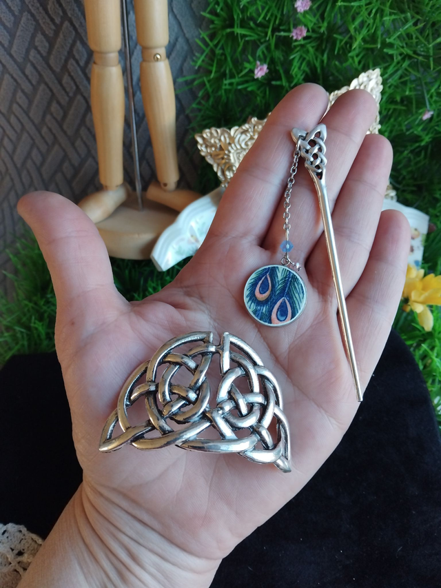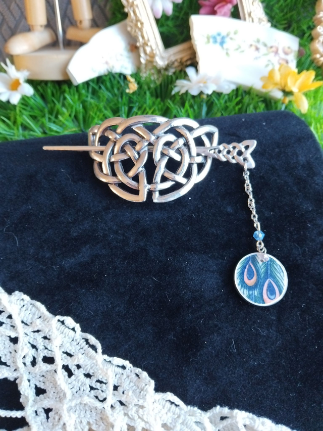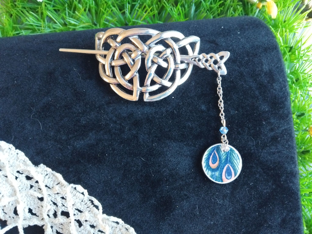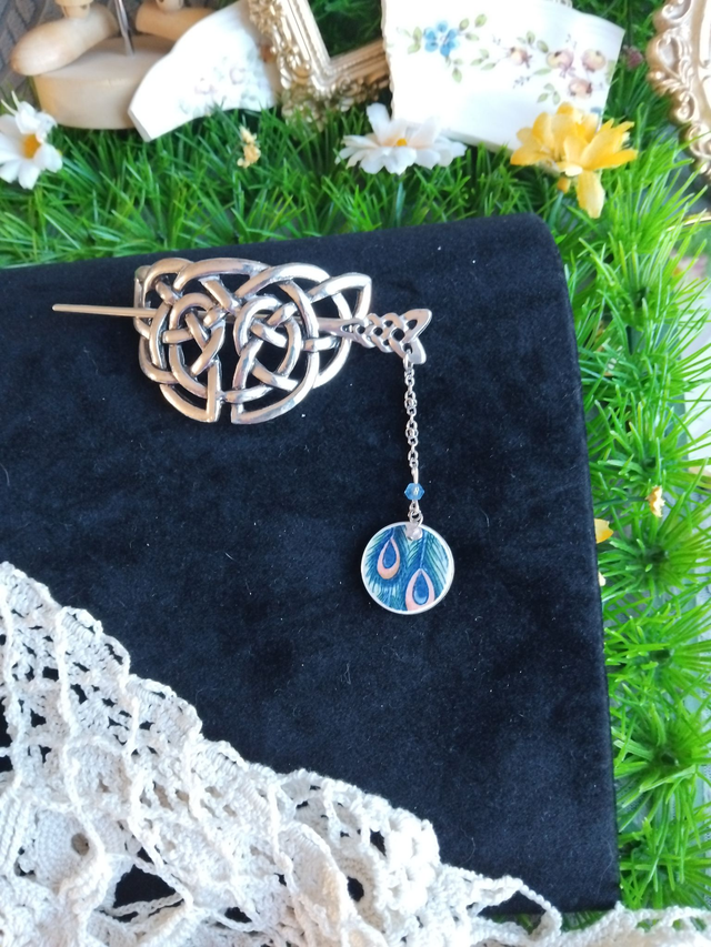 joli pic à cheveux accompagné d'un cabochon réalisé avec de la vaisselle ancienne