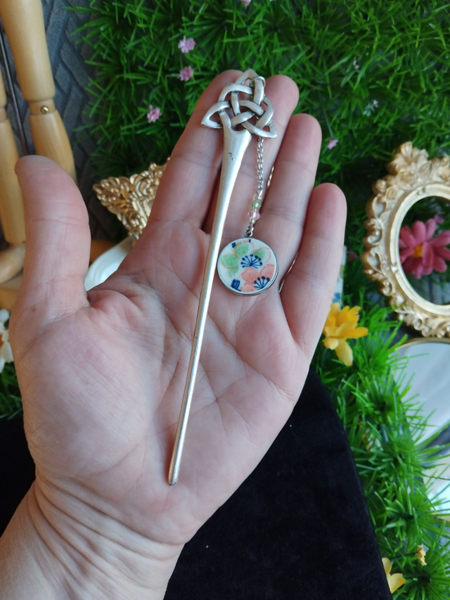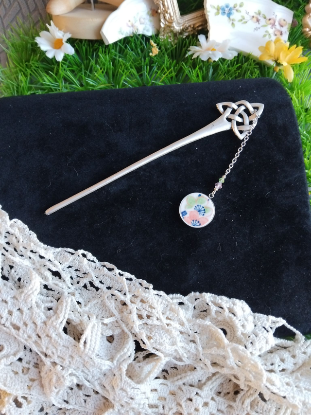 joli pic à cheveux accompagné d'un cabochon réalisé avec de la vaisselle ancienne