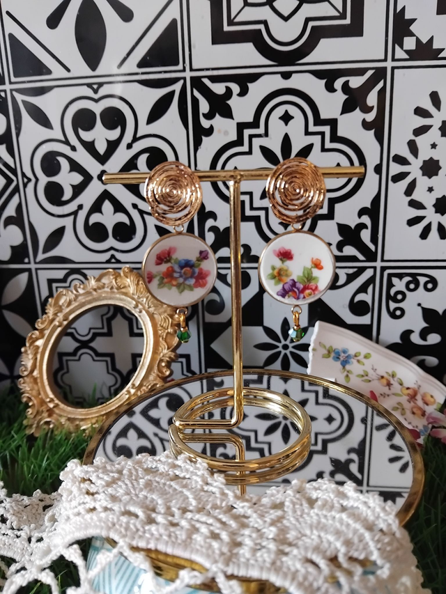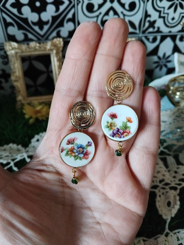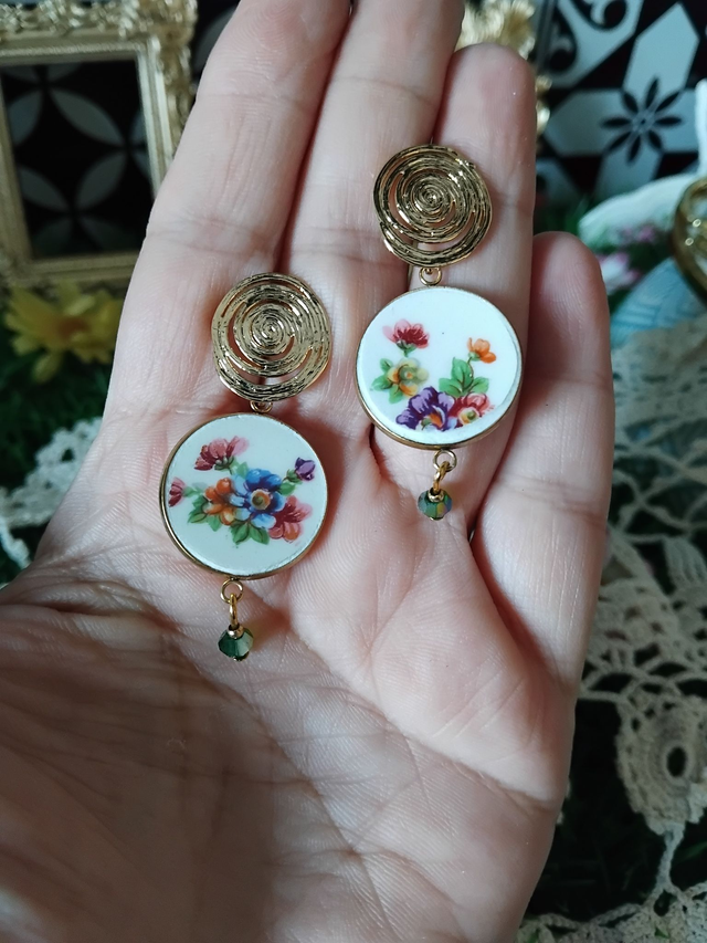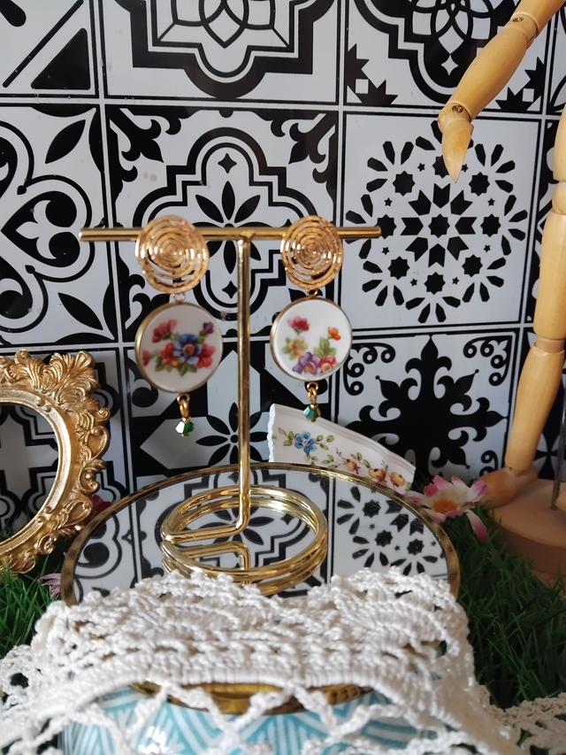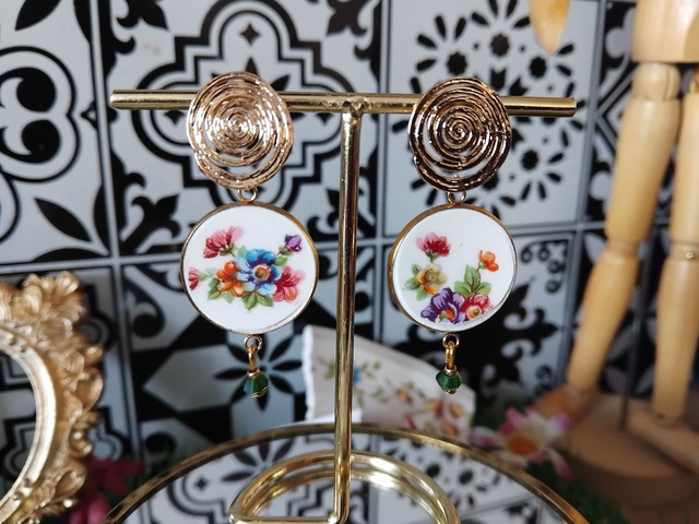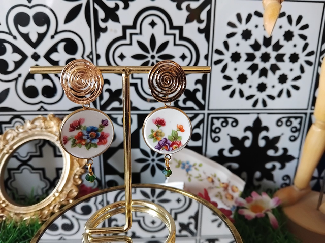 paire de boucles d'oreille réalisée avec de la vaisselle ancienne.